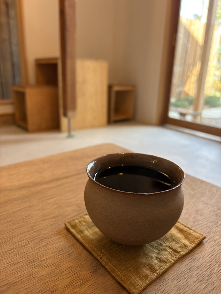 木の温もりを感じる、簡素で無駄のない空間に、侘び寂びを感じる器に注がれたコーヒー。